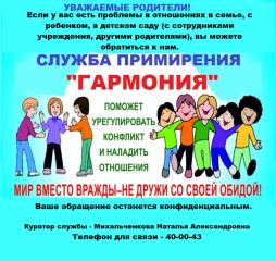 В детском саду работает служба медиации (примирения). Есть конфликт - обращайтесь. Куратор службы - Михальченкова Наталья Александровна. Телефон службы - 40-00-43